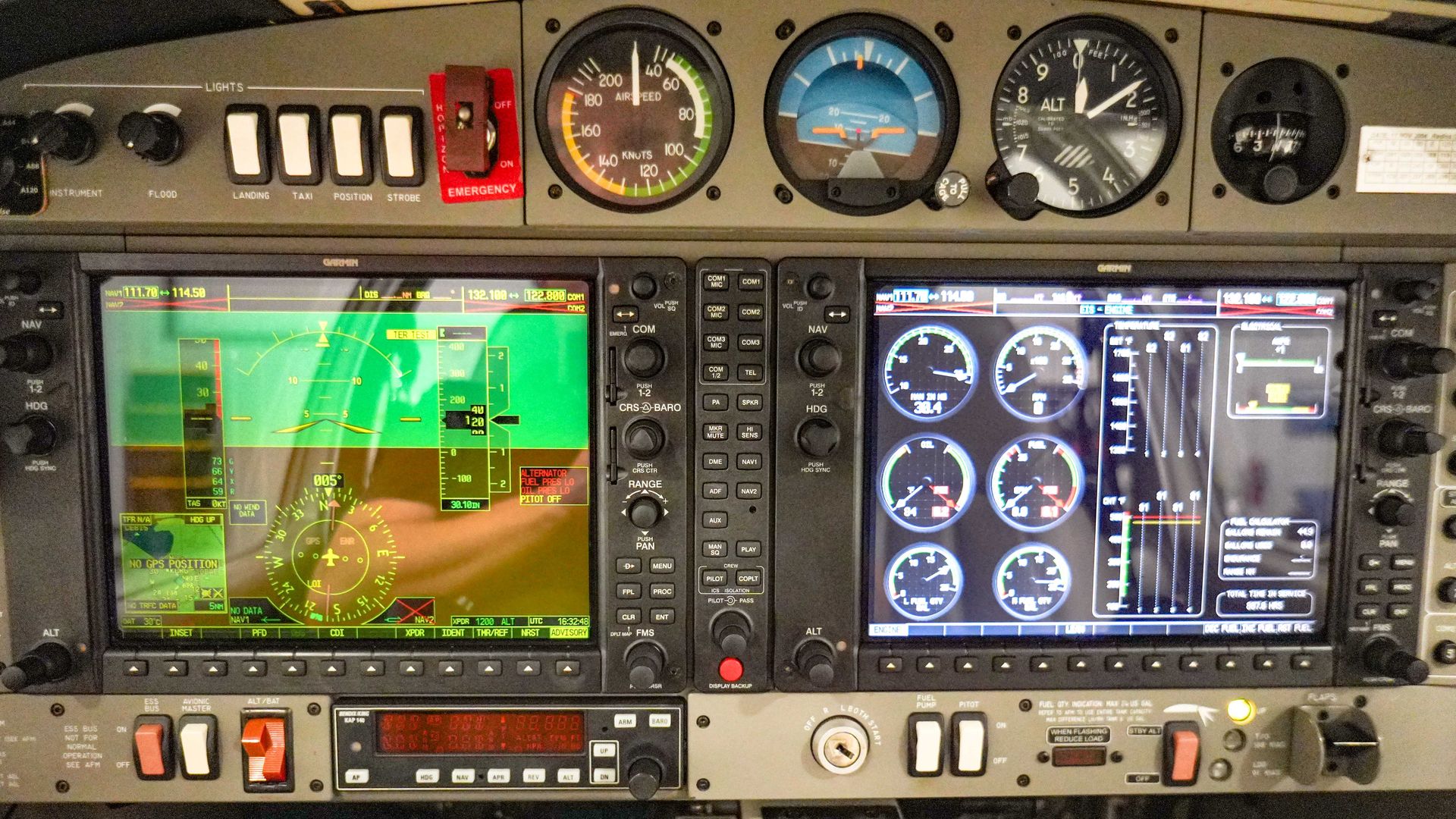 - 4 Garmin GDU1040, 10 inch primary flight display (PFD), high resolution with clear sunlight readability, wide horizon, three-axis flight dynamics, air speed,altitude, vertical speed, Horizontal Situation Indicator (HSI) with 360-degree, arc, and perspective modes