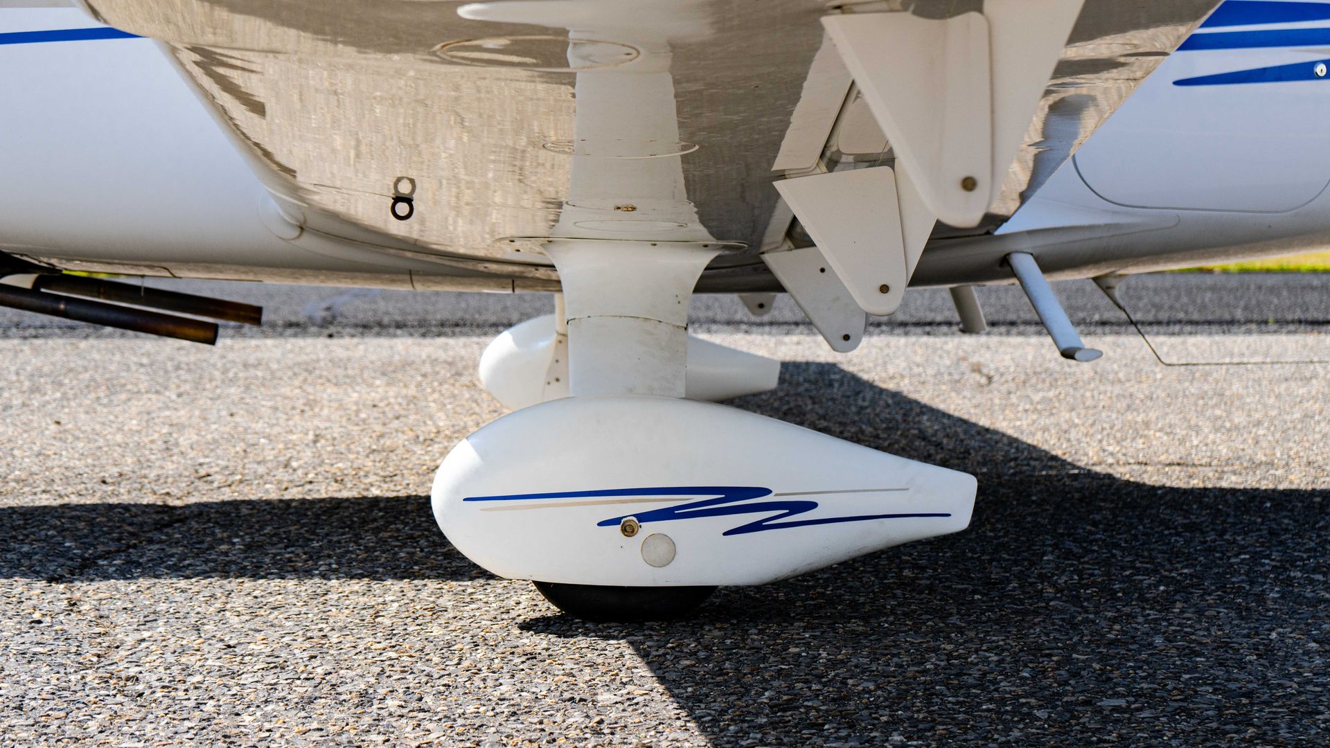 On the ramp, the aircraft still shines in its white paint with blue, gray, and yellow accents, always kept in a hangar and showing excellent condition for its age. Inside, the black interior with sheepskin seat covers and Rosen sun visors makes for a comfortable and practical cabin environment.