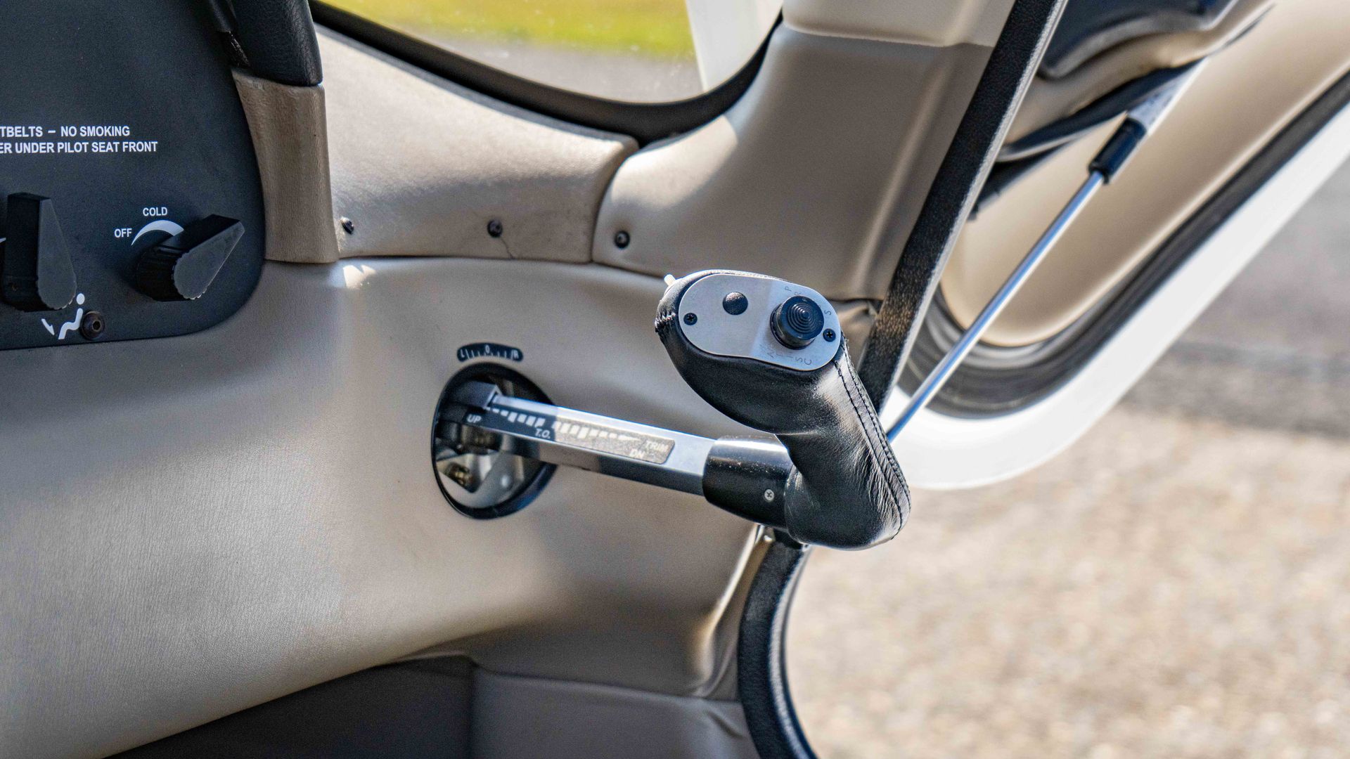 Black interior in good condition with dark sheepskin seat covers for added comfort and Rosen sun visors to reduce glare in flight. Well-kept and clean, offering both practicality and comfort for pilot and passengers.