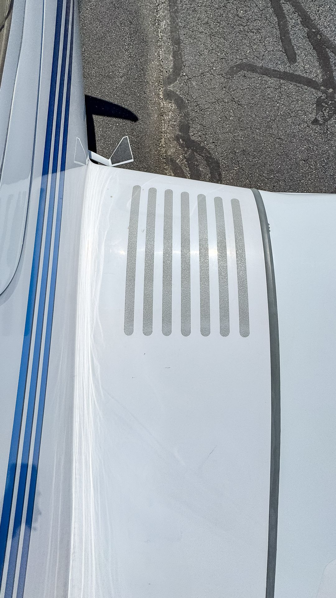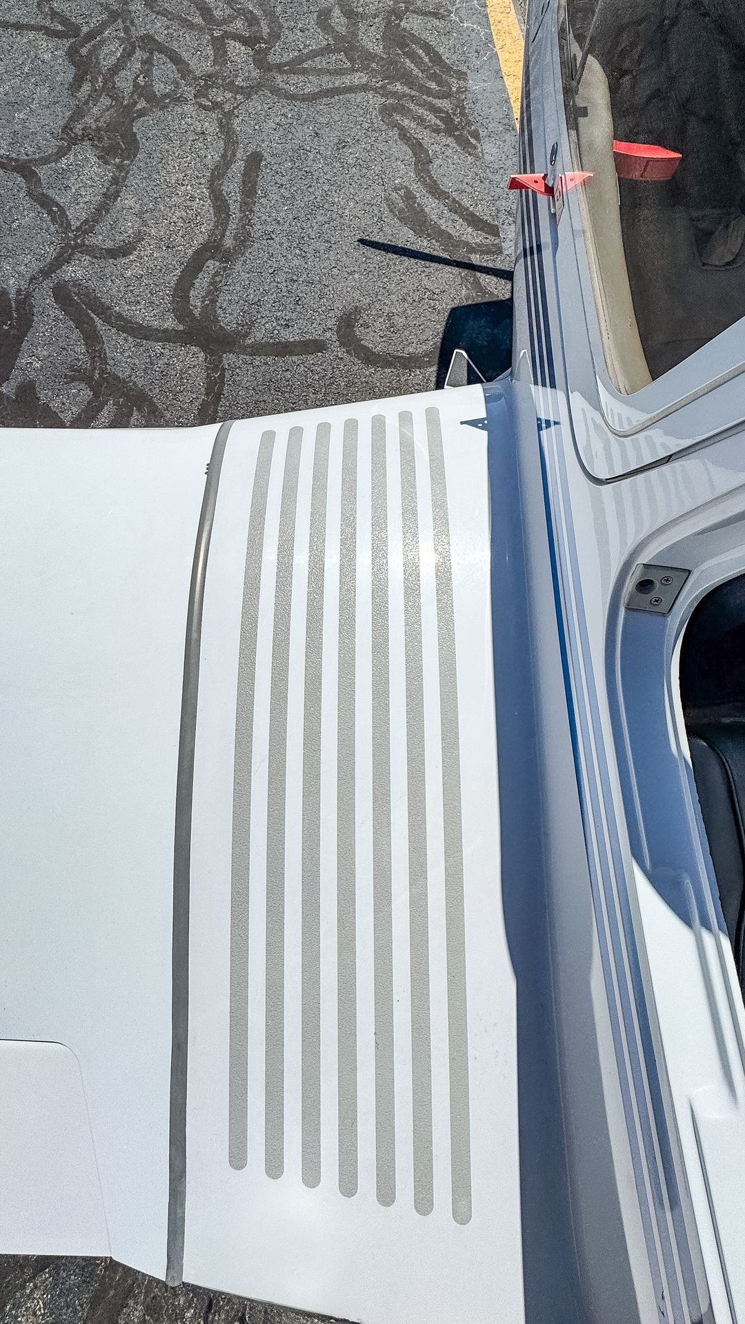 - White paint with blue stripes