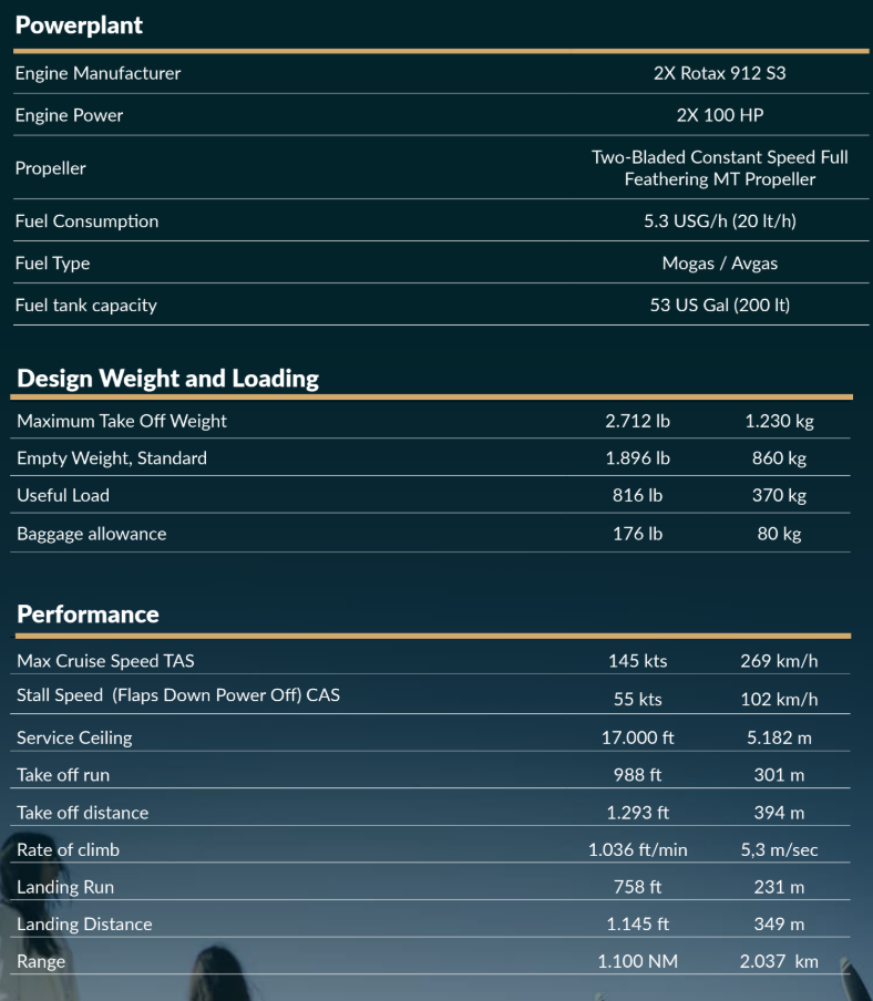 - Engines – 2 Rotax 912S3 100 Hp, 4 Cylinders